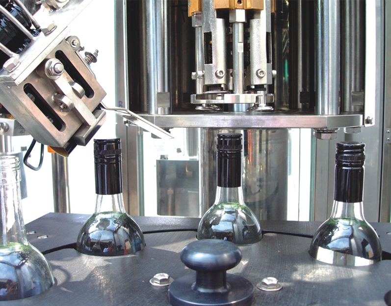 The machine combines with filling, cork inserting and aluminum capping three functions in one machine and could choose to insert cork or seal aluminum cap only. It adopts gravity filling. The filling level depends on the position of air drain hole, and could be controlled by adjusting the height of gaskets.
