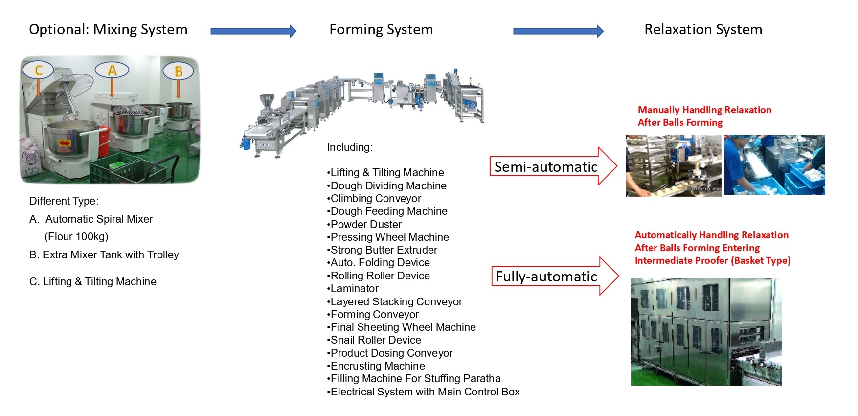 Flour Mixing → Forming → Dough Relaxing → Ball Placing → Pressing→ Filming & Stacking → Packaging